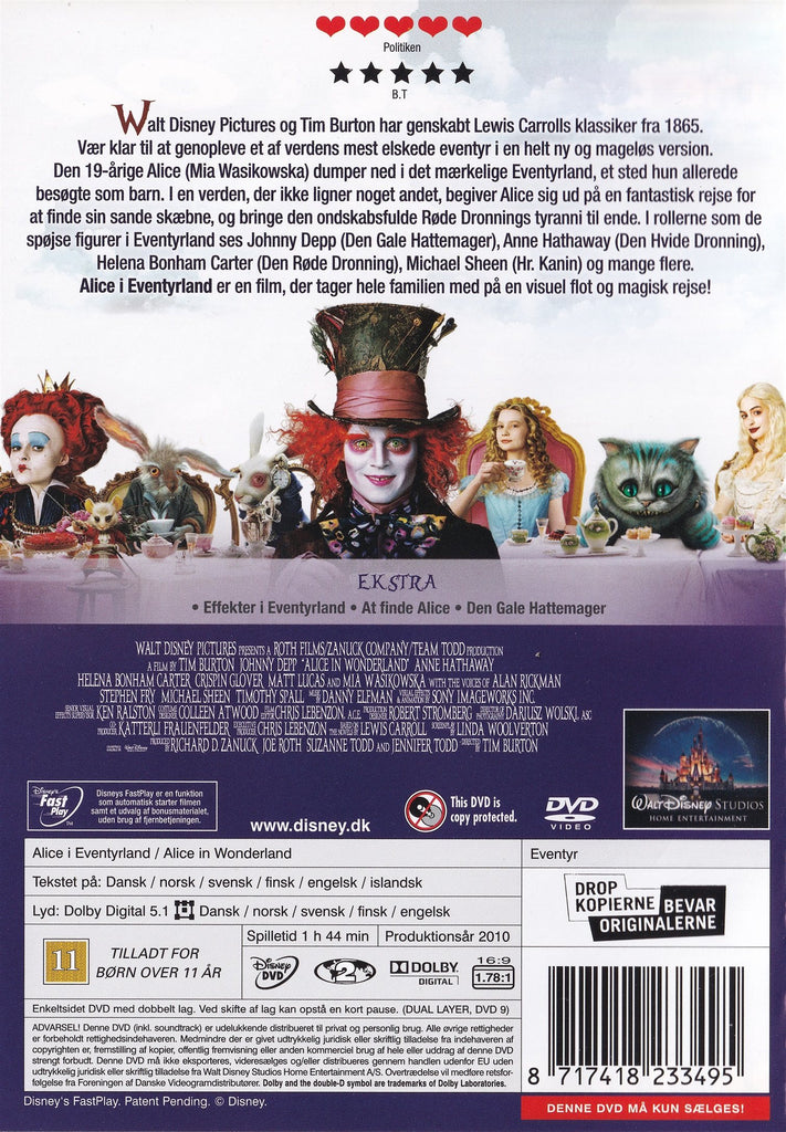 Walt Disney Pictures og Tim Burton har genskabt Lewis Carrolls klassiker fra 1985. Vær klar til at genopleve et af verdens mest elskede eventyr i en helt ny og mageløs version. Den 19-årige Alice (Mia Wasikowska) dumper ned i det mærkelige Eventyrland, et sted hun allerede besøgte som barn. I en verden, der ikke ligner noget andet, begiver Alice sig ud på en fantastisk rejse for at finde sin sande skæbne, og bringe den ondskabsfulde Røde Dronnings tyranni til ende. I rollerne som de spøjse figurer i Eventyrland ses Johnny Depp (Den Gale Hattemager), Anne Hathaway (Den Hvide Dronning), Helena Bonham Carter (Den Røde Dronning), Michael Sheen (Hr. Kanin) og mange flere.